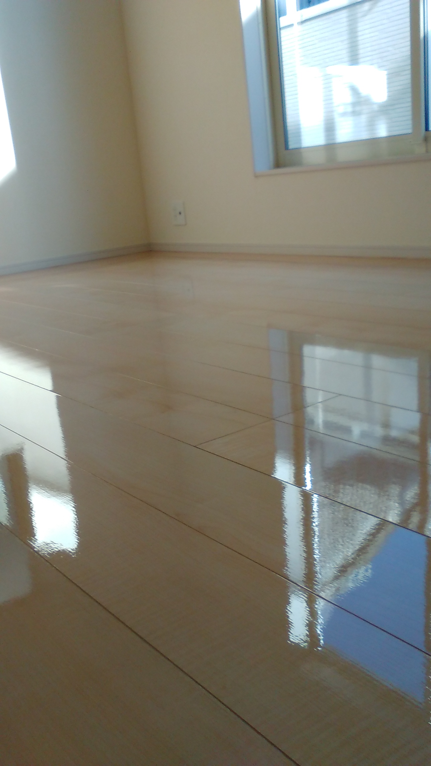 こちらのフローリングはプレミアムコート塗布直後のためツヤ感が強調されておりますが、乾燥後はフローリングの風合いを生かしたマットな仕上がりとなります