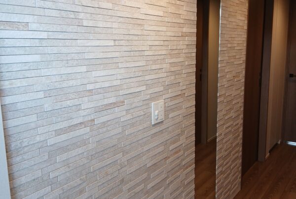 施工後 ③ストーンⅡ(STN1)アイボリー:玄関 ⑤オーダーミラー(クリアミラー小口磨き):玄関