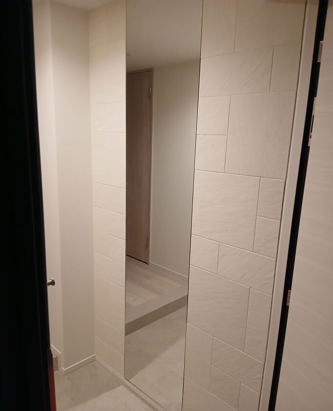 施工後 ③ストーンⅡ(STN1)アイボリー:玄関 ⑤オーダーミラー(クリアミラー小口磨き):玄関
