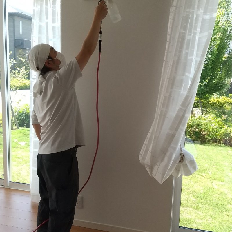 当社では無光(空気)触媒コーティングが御座います。クロス面にチタンを噴霧いたしまして施工いたします。 施工面が空気に触れることにより触媒効果を発揮し、室内の消臭、有害物質の分解、防カビ、帯電防止(埃の吸い付きを軽減)など様々な効果を発揮いたします。