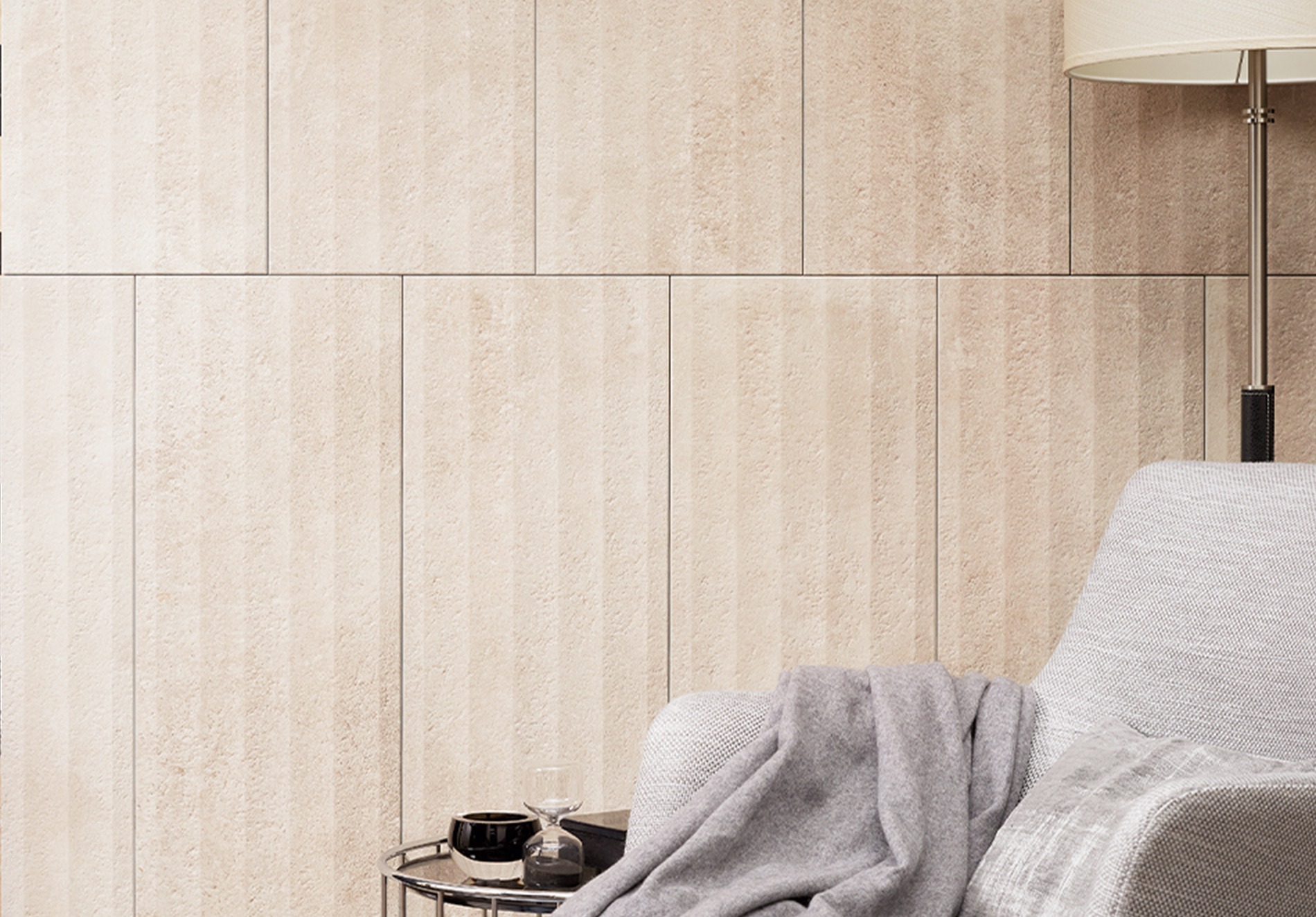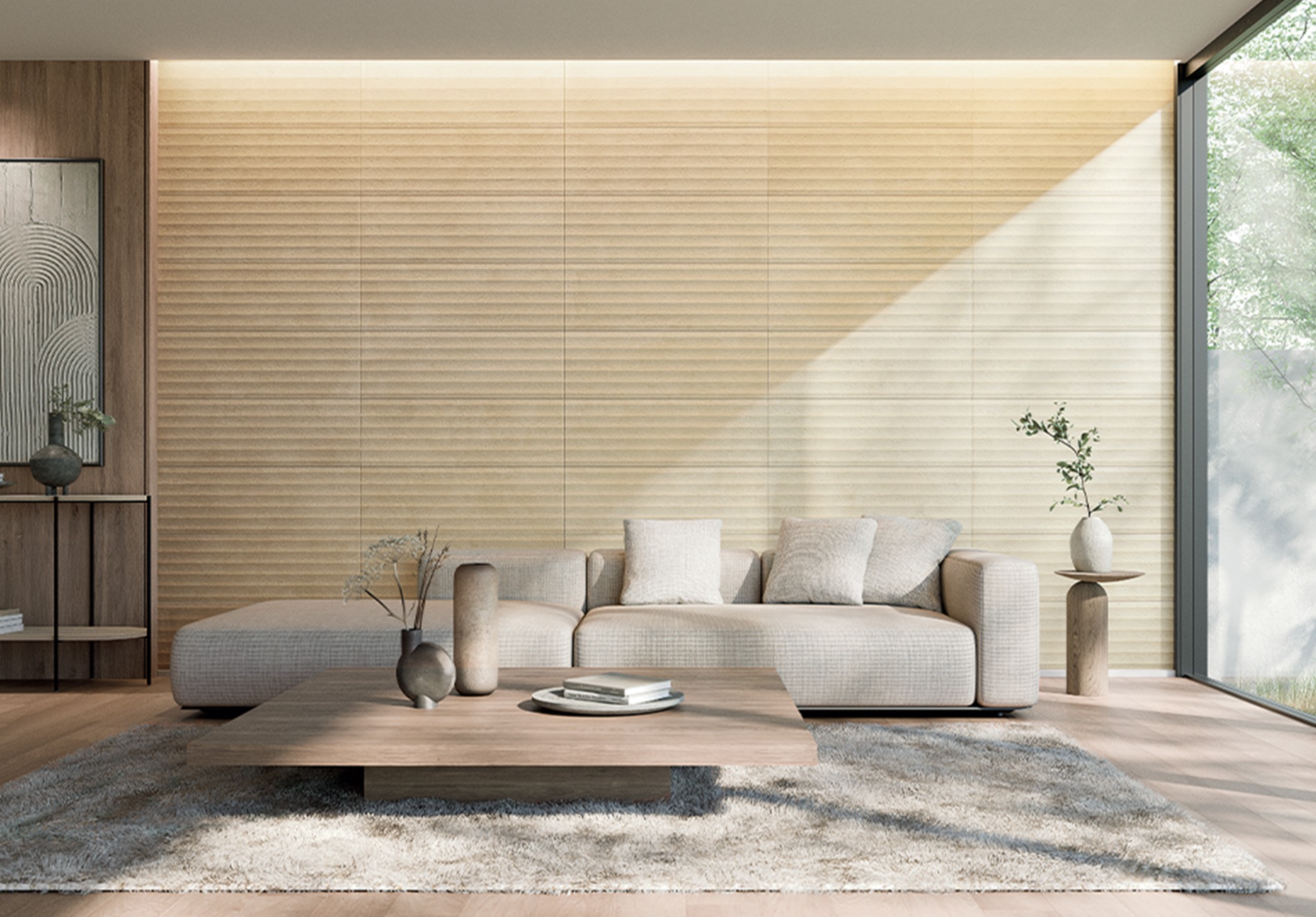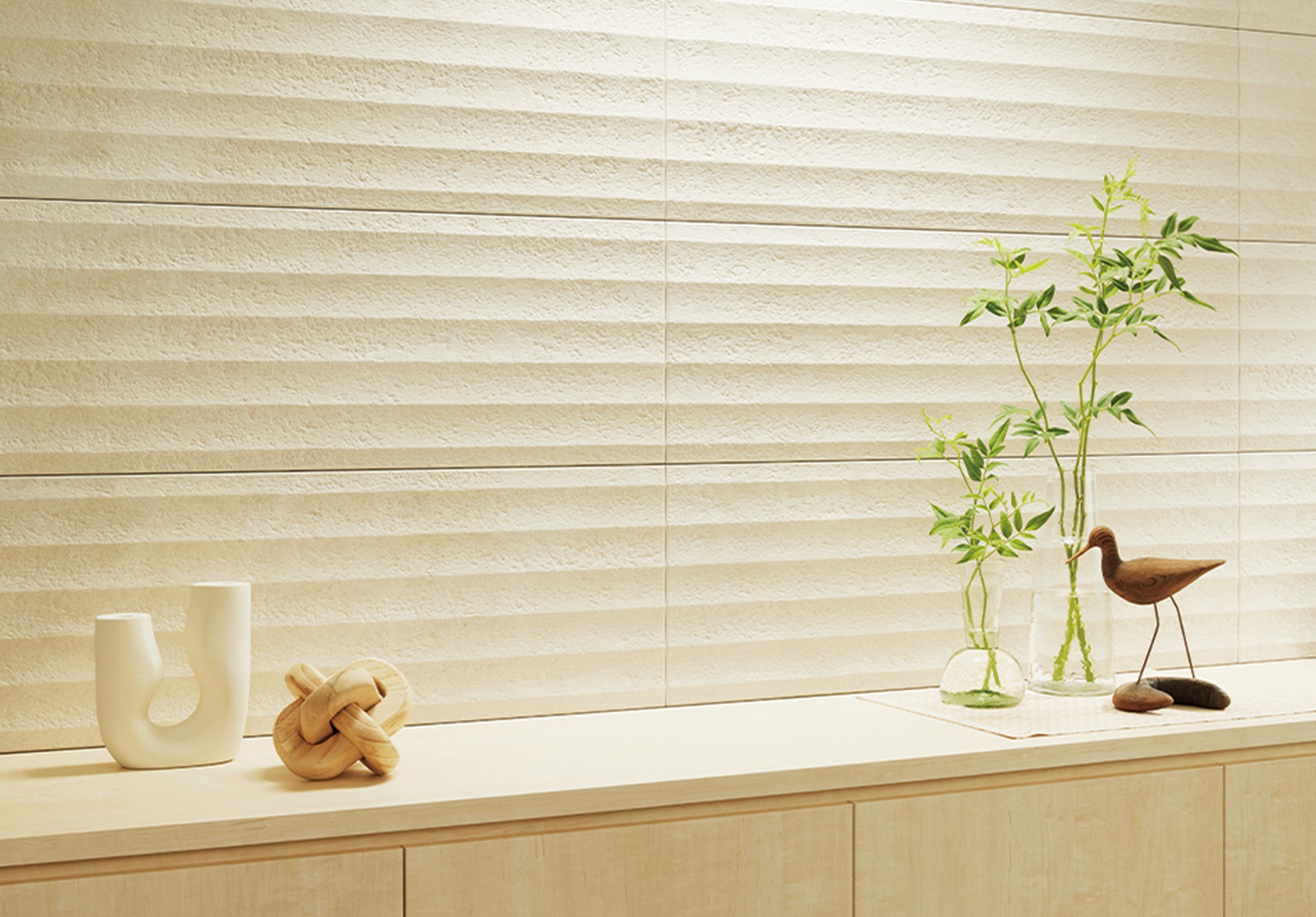 空間にやさしい素材感を添えるために、左官仕上げの土壁を思わせる穏やかな表情に、セメント特有の風合いを重ねたデザインは、上質さと落ち着きのある雰囲気を醸し出します。自然な陰影や豊かな質感が空間に調和し、心地よい印象を演出します。